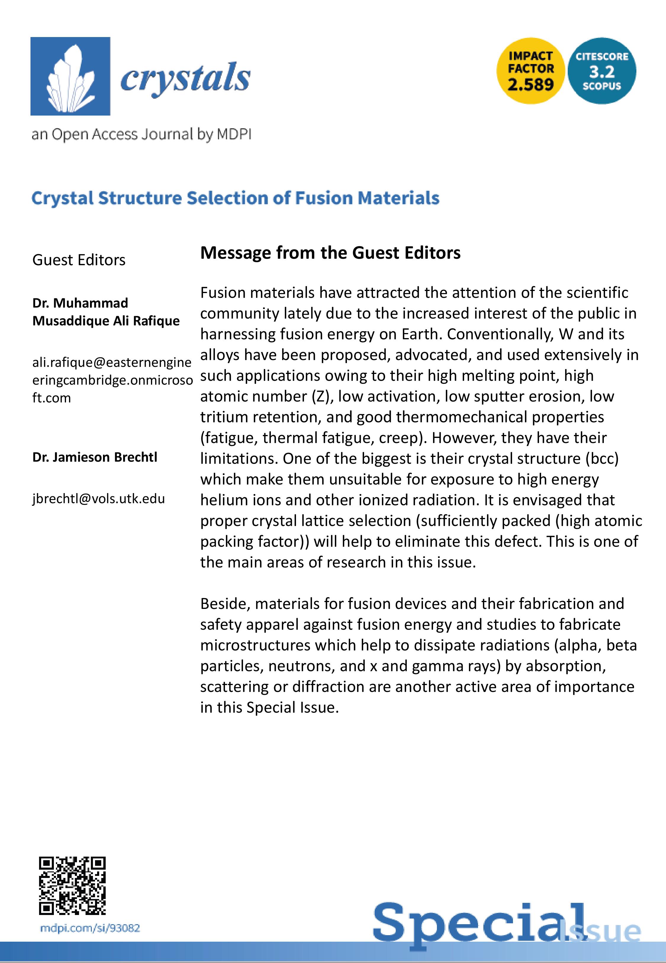Call for papers – MDPI Crystals Special Issue – Crystal structure selection of fusion materials