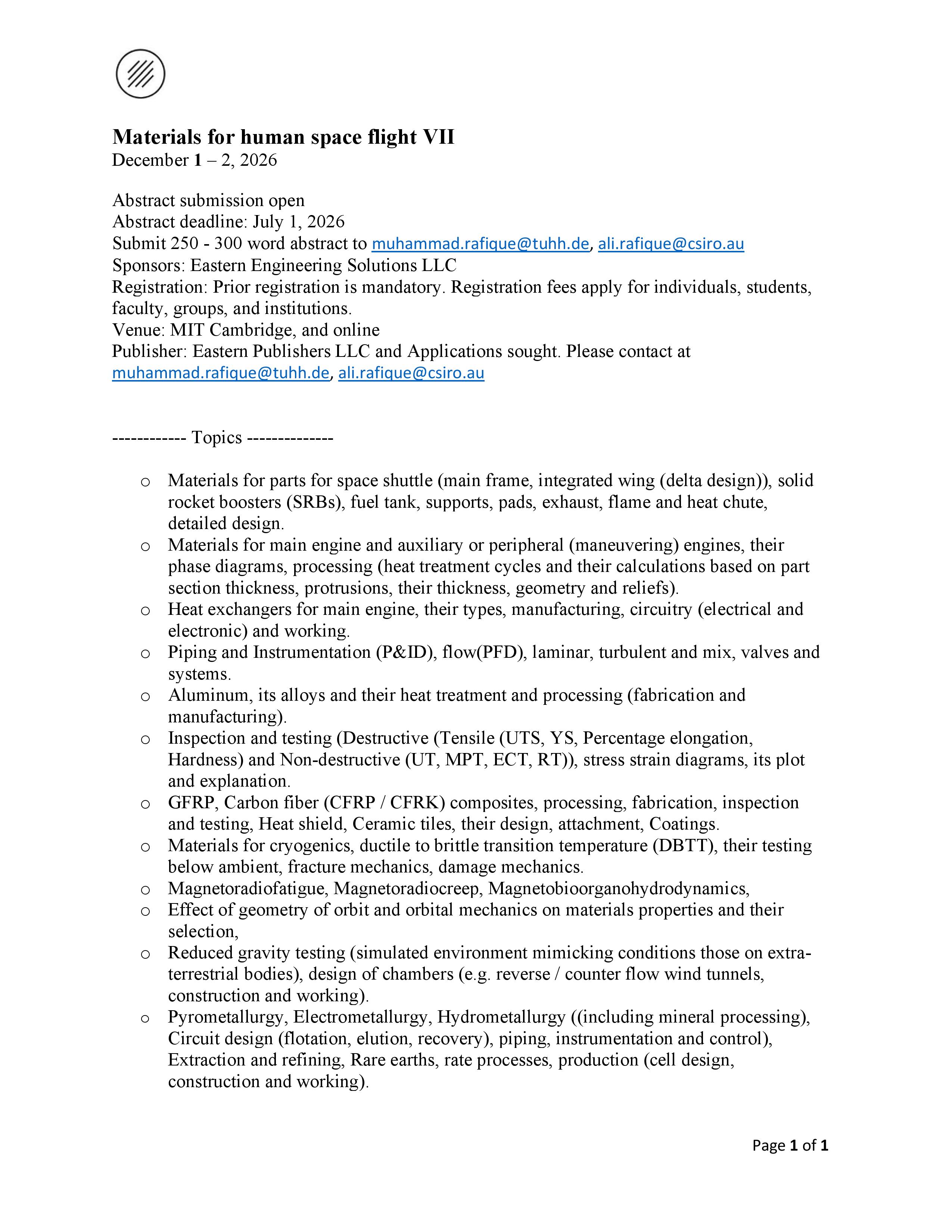 • Materials for human space flight VII December 2, 2025